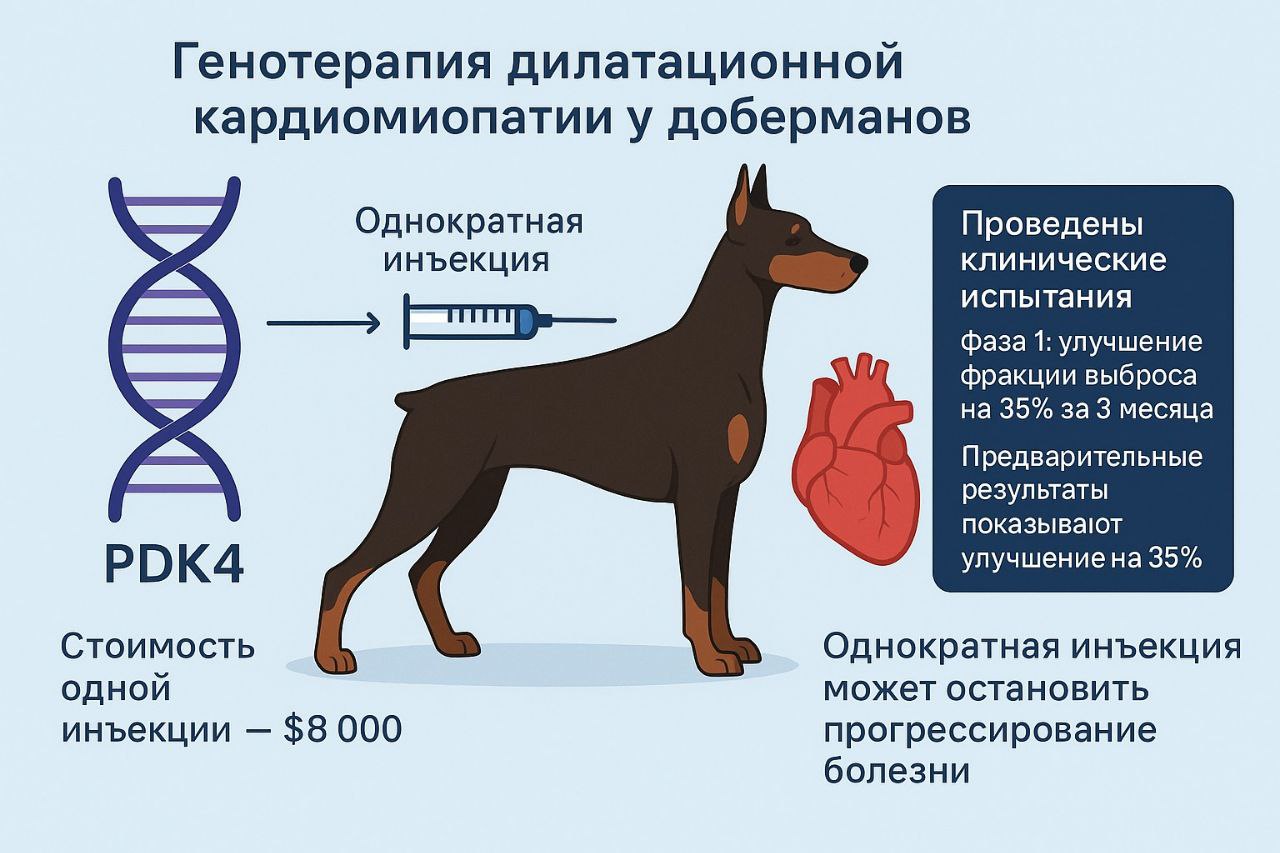 Метод основан на редактировании гена PDK4 с помощью аденоассоциированного вируса. В исследовании участвуют 50 собак с ранними стадиями заболевания. Предварительные результаты показывают улучшение функции сердца на 35% за 3 месяца. Терапия проводится однократной инъекцией и стоит около $8,000. Учёные надеются остановить прогрессирование болезни, которая обычно убивает доберманов к 5-7 годам. Параллельно идёт работа над тестом для выявления носителей мутации. Владельцы участников отмечают увеличение активности и аппетита у питомцев. В случае успеха технологию адаптируют для боксёров и догов. Это первый случай применения генотерапии для наследственных болезней собак в клинической практике. Окончательные результаты ожидаются в 2027 году.