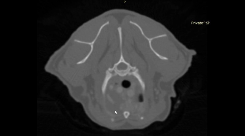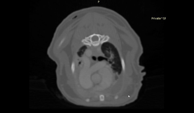 Результаты КТ подтвердили наши предположения по УЗИ: свернутые листки плевры и крупные реактивные лимфатические узлы могли имитировать новообразование на рентген-снимках, из-за чего могло изначально возникнуть неверное предположение, однако детализированное УЗИ и КТ опровергли его. Владельцу была разъяснена необходимость продолжить лечение у хирурга с обязательной постановкой плевральных дренажей и коррекцией курса антибиотика по результатам посева.